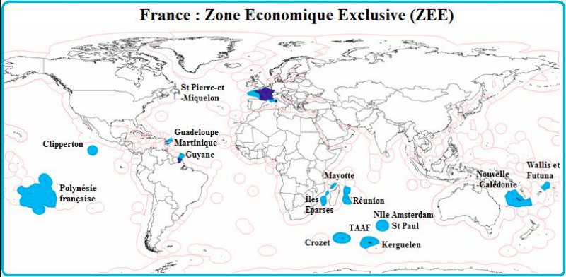 La France possède le second domaine maritime mondial avec 11 millions de km2. La première place étant occupé par les états unis. La raison de cette immensit2 réside dans les DROM repartis sur toutes les mers du globe. On peut citer la Polynésie française, la nouvelle Calédonie, wallis et futuna, la Guyane et les Antilles et enfin les TAAF. Sur les 11 millions de km2 97% proviennent de ces territoires ultramarins. A savoir que les ZEE sont regis par le droit de la mer grâce a la convention de Montego bay qui permet à chaque états d’établir une ZEE jusqu’à 200 milles marins de ses cotes. La France a également déposé un dossier pour étendre son plateau continental au-delà des 200 milles marins dans certaines zones lui conférant la première place. Fort de ce seul constat la France se doit d’avoir une stratégie maritime associe a la puissance navale pour la protection de ses territoires et rester crédibles. Dans ses territoires ultra marins il y a la nouvelle Calédonie situe dans la zone indopacifique, zone où a lieu un basculement géopolitique actuel La présence française en indopacifique n’est pas nouvelle, elle date du 17iem siècle. Aujourd’hui indopacifique on de nos compatriotes vivent sur ces territoires, auxquels il faut ajouter indo-pacifique00 000 Français vivant dans les autres pays de la région, soit plus d’1,8 million de personnes. La possession d’une ZEE si vaste constitue un atout stratégique pour notre pays cela nous permet d’être présent l’Indopacifique qui Plus que jamais, représente donc une priorité pour la France [1].