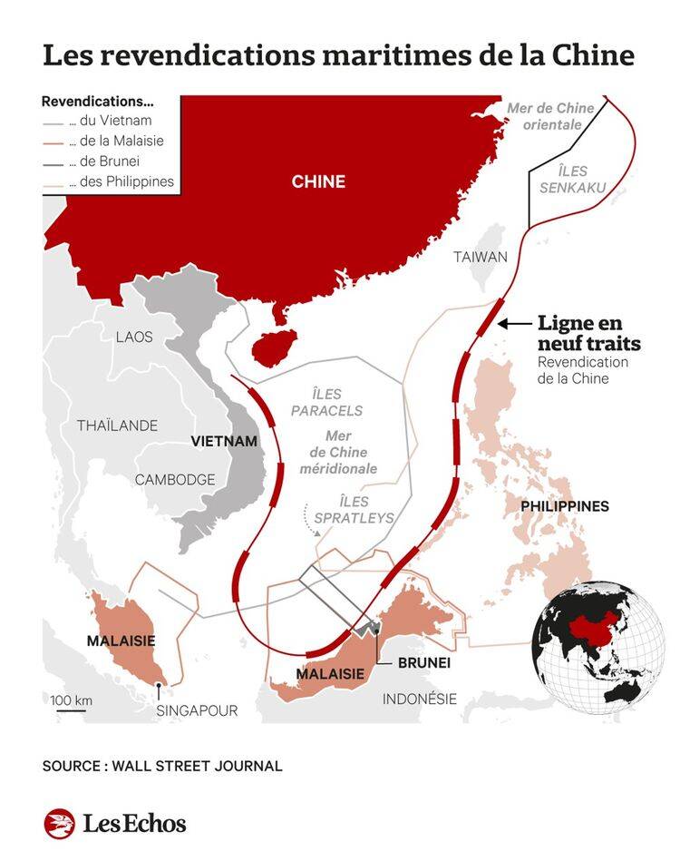 Fort de ce constat en 2003 le président Chinois Hu Jintao dévoile le dilemme de Malacca. Le constat est simple l’économie chinoise dépend en grande partie de son approvisionnement et exportation qui passe par Malacca. Ce détroit prendra d’autant plus d’importance que dans un des volets du plan China 2049 il y est question de la réunification de Taiwan sur laquelle nous allons revenir, mais aussi du projet de la new belt road (BRI) ou nouvelle route de la soie initie par xi Jinping passant par Malacca et du point de vu chinois rend d’autant plus nécessaire le control de la mer de chine méridionale. C’est pourquoi en 2012 Hu Jintao appelle la chine à devenir une puissance maritime. La nature même de la géographie chinoise donne lieu à un paradoxe : c’est un pays immense mais dont le domaine maritime est enclavé. Au nord par la mer jaune, à l’est par la mer de chine orientale et au sud par la mer de chineméridionale. De ce fait la Chine possède un rapport zones économique exclusives sur surface terrestre de 0,4 contre 1,2 pour les états unis et 17,2 pour la France [2]. Ce constat a donné la stratégie maritime des onze traits apparue pour la première fois sur une carte chinoise en 1947, sous le nom de ligne en onze traits, réduite à neuf dans les années 1950, solution à la problématique de l’enclavement le domaine maritime chinois. Elle englobe environ 90 % de la mer de Chine méridionale, incluant les archipels des Spratleys, Paracels, Pratas, et le banc Macclesfield. La Chine affirme que ces zones sont historiquement sous sa souveraineté. En 2016, la Cour permanente d’arbitrage de La Haye a jugé que : La ligne en neuf traits n’a aucune base légale selon la Convention des Nations Unies sur le droit de la mer (CNUDM). La Chine a refusé de reconnaître cette décision, la qualifiant de "nulle et non avenue".
