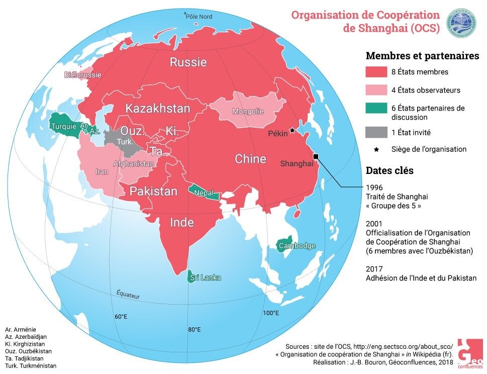 Le dynamisme de cette zone pivot s’exprime également par plusieurs alliances dans la région : l’OCS L’Organisation de coopération de Shanghai (OCS) est une alliance régionale fondée en 2001 à l’initiative de la Chine et de la Russie, avec pour objectif principal la sécurité collective, la coopération économique et le dialogue politique en Eurasie. Elle a pour membre fondateurs : Chine, Russie, Kazakhstan, Kirghizistan, Tadjikistan, Ouzbékistan. Elle a depuis accueillie de nouveaux membres : Inde, Pakistan (2017), Iran (2023), Biélorussie (2024). Elle a comme pays observateurs la Mongolie, Afghanistan, Turquie, entre autres. Ensemble, ils représentent plus de 40 % de la population mondiale.
